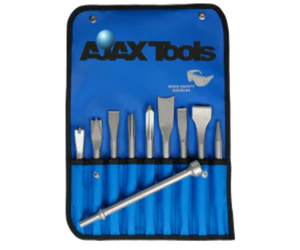 The Ajax Tools 9-pc Master Chisel Set, No. 9029, offers a wide range of professional-grade, American-made chisels. Each chisel has been selected to give the technician the ability to complete the most demanding applications necessary to get the job done. This set includes a scraping chisel, bushing splitter, claw ripper, muffler cutter, panel cutter, flat chisel, tapered punch, rivet cutter, and Kwik Cutter chisel.