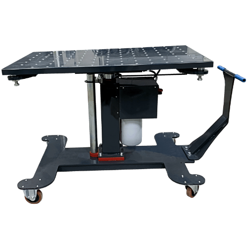 Challenger also offers two EV lift tables – the BT3000 and the BT3300. Though both lift tables can be used to install and remove EV batteries, battery packs, transmissions, etc., the BT3000 offers a higher maximum height at 79.5” and has a rechargeable battery. On the other hand, the BT3300 can be easily maneuvered with its pallet-jack-style handle and extending, adjusting, and tilting top plate.